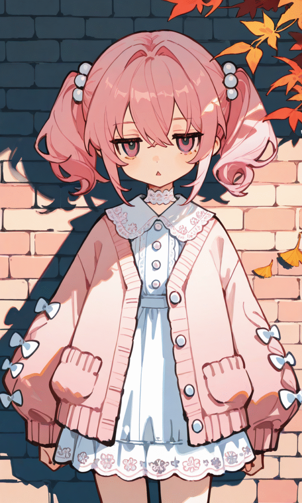 little girl,pink hair, twintail,jitome,triangle mouth, autumn girly outfit, lace collar dress, fluffy cardigan, romantic style, pearl buttons, delicate accessories, standing, brick street background,looking at viewer, cowboy shot, masterpiece,high quality,high resolution ,tokiame,clndl_style