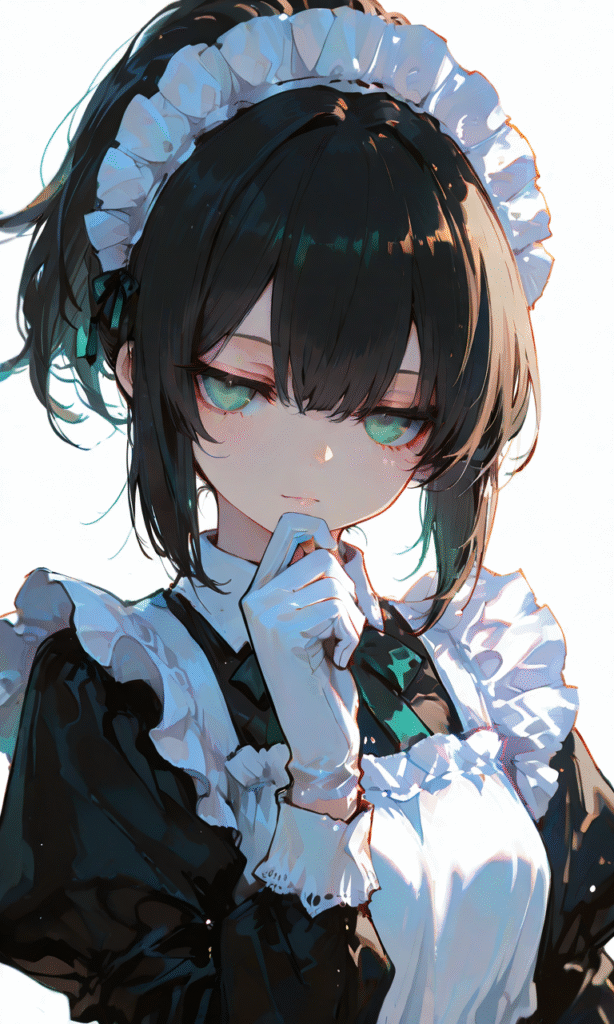 maid,black hair, short hair, ponytail,jitome,green eyes, long sleeves, gloves, looking at viewer, upper body, simplebackground,white background, masterpiece,high quality, ,hyper-detailed, high contrast, depth of field, ray tracing, best lighting, cinematic composition, beautiful face, beautiful eyes, sharp focus, (masterpiece:1.2), (best quality:1.2), (very aesthetic:1.2), (absurdres:1.2), (detailed background),tokiame