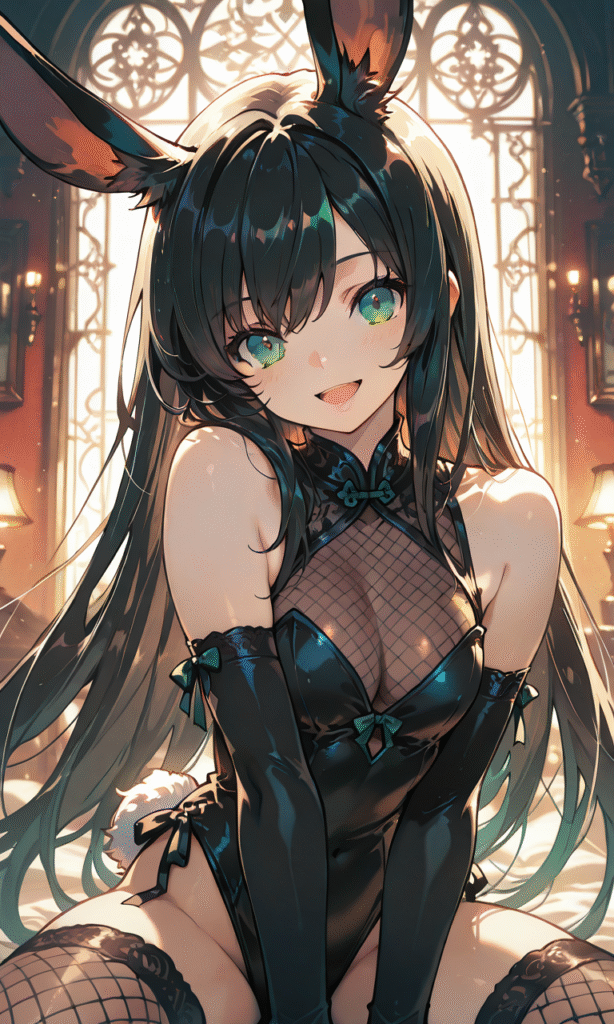 PixAI【Shiitake-Mix】girl,black hair, long hair, straight hair,green eyes, china dress bunnygirl,elbow gloves, fishnet thighhighs,upper body, smile, open mouth, masterpiece,high quality, high resolution, Fantasy Scene,tokiame, Fantasy Scene, ,hyper-detailed, high contrast, depth of field, ray tracing, best lighting, cinematic composition, beautiful face, beautiful eyes, sharp focus, (masterpiece:1.2), (best quality:1.2), (very aesthetic:1.2), (absurdres:1.2), (detailed background),