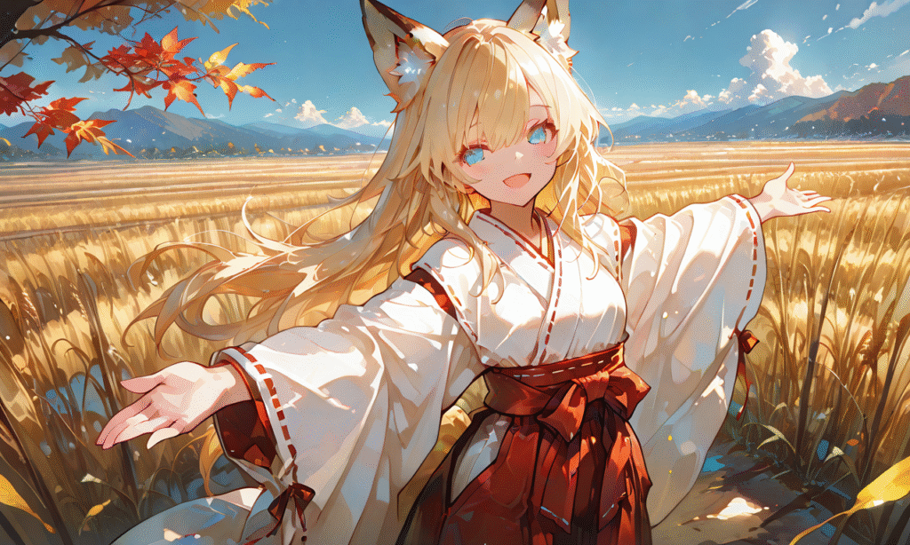 girl,fox ears, blonde hair, long hair, miko,((rice field)),autumn, blue sky,spread arms, smile,open mouth,from above, cowboy shot,masterpiece,high quality, ,tokiame, Fantasy Scene, ,((4k,8k,Ultra HD)),((Masterpiece :1.2)),((Best quality :1.2)),((Detailed :1.5)),((Detailed background :1.5)),hyper-detailed, high contrast, depth of field, ray tracing, best lighting, cinematic composition, beautiful face, beautiful eyes, sharp focus, (masterpiece:1.2), (best quality:1.2), (very aesthetic:1.2), (absurdres:1.2), (detailed background),748cmstyle,(detailed_hands:1.5)girl,fox ears, blonde hair, long hair, miko,((rice field)),autumn, blue sky,spread arms, smile,open mouth,from above, cowboy shot,masterpiece,high quality, ,tokiame, Fantasy Scene, ,((4k,8k,Ultra HD)),((Masterpiece :1.2)),((Best quality :1.2)),((Detailed :1.5)),((Detailed background :1.5)),hyper-detailed, high contrast, depth of field, ray tracing, best lighting, cinematic composition, beautiful face, beautiful eyes, sharp focus, (masterpiece:1.2), (best quality:1.2), (very aesthetic:1.2), (absurdres:1.2), (detailed background),748cmstyle,(detailed_hands:1.5)