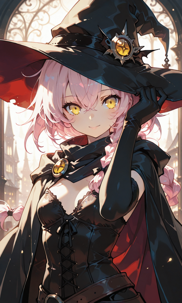 girl,devils,light pink hair,single braid,yellow eyes, witch,black elbow gloves,scarf,cloak,Bustier,hand_on_headwear,small breast,upper body,masterpiece,high quality, high resolution, Fantasy Scene,tokiame, Fantasy Scene, ,hyper-detailed, high contrast, depth of field, ray tracing, best lighting, cinematic composition, beautiful face, beautiful eyes, sharp focus, (masterpiece:1.2), (best quality:1.2), (very aesthetic:1.2), (absurdres:1.2), (detailed background)