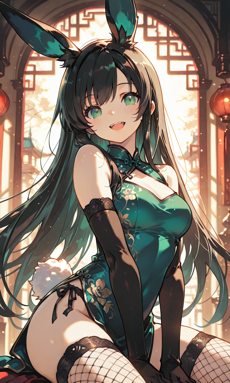 PixAI【Shiitake-Mix】girl,black hair, long hair, straight hair,green eyes, china dress bunnygirl,elbow gloves, fishnet thighhighs,upper body, smile, open mouth, masterpiece,high quality, high resolution, Fantasy Scene,tokiame, Fantasy Scene, ,hyper-detailed, high contrast, depth of field, ray tracing, best lighting, cinematic composition, beautiful face, beautiful eyes, sharp focus, (masterpiece:1.2), (best quality:1.2), (very aesthetic:1.2), (absurdres:1.2), (detailed background),