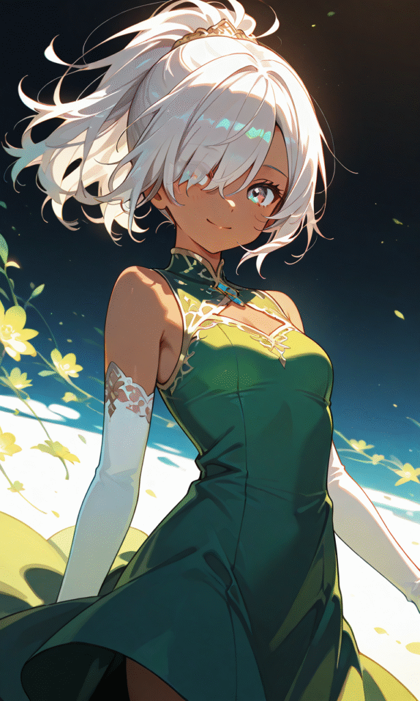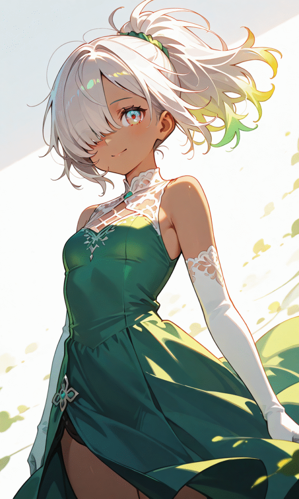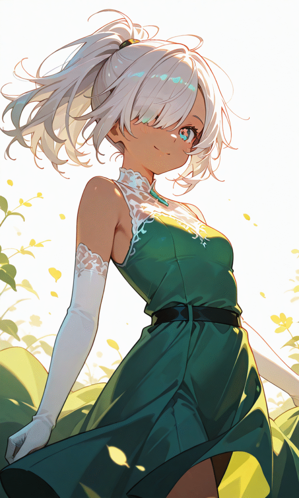 1girl, silver hair, ponytail, hair over one eye, dark skin, small breasts, green gown, sleeveless, white elbow gloves, smile, cowboy shot, simple background, white background, masterpiece, high quality, high resolution, large anime eyes, vivid color palette, cinematic lighting, cinematic angle, soft light, color detail, backlighting, depth of field, long exposure, light steps, intricate colors, vibrant colors