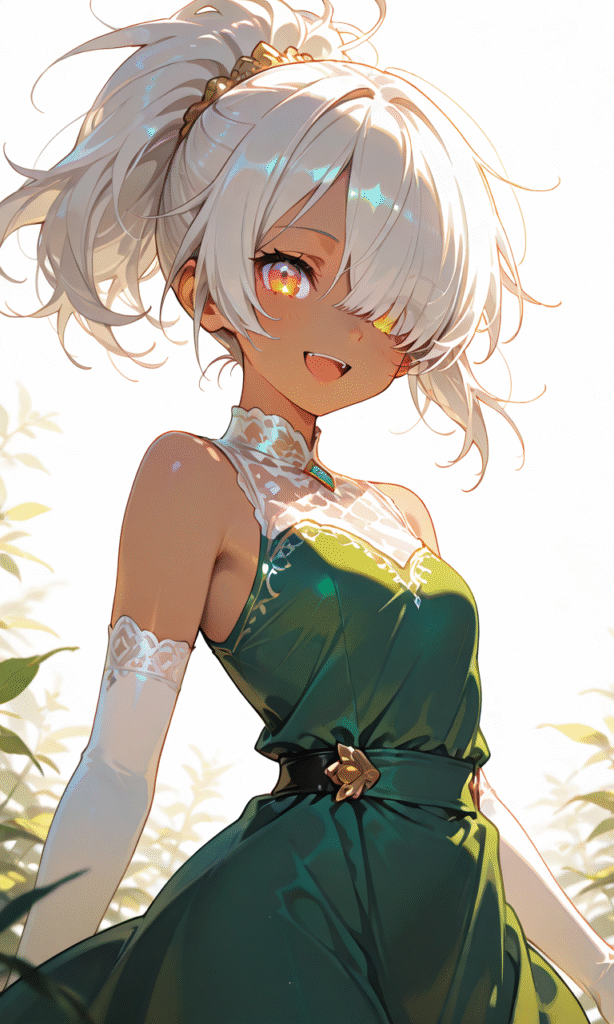 1girl, silver hair, ponytail, hair over one eye, dark skin, small breasts, green gown, sleeveless, white elbow gloves, smiling, open mouth, cowboy shot, simple background, white background, masterpiece, high quality, high resolution, large anime eyes, vivid color palette, hyper-detailed, high contrast, depth of field, ray tracing, best lighting, cinematic composition, beautiful face, beautiful eyes, sharp focus, (masterpiece:1.2), (best quality:1.2), (very aesthetic:1.2), (absurdres:1.2), (detailed background)