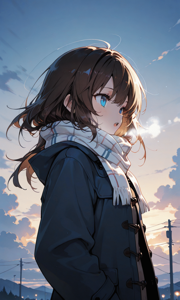 PixAI【Shiitake-Mix】1girl, duffel coat, scarf, dawn, cloudy sky, white breath, open mouth, upper body, from side, from below, masterpiece, high quality, high resolution, hyper-detailed, high contrast, depth of field, ray tracing, best lighting, cinematic composition, beautiful face, beautiful eyes, sharp focus, (masterpiece:1.2), (best quality:1.2), (very aesthetic:1.2), (absurdres:1.2), detailed background, tokiame