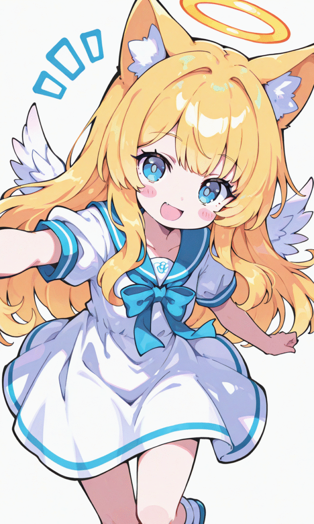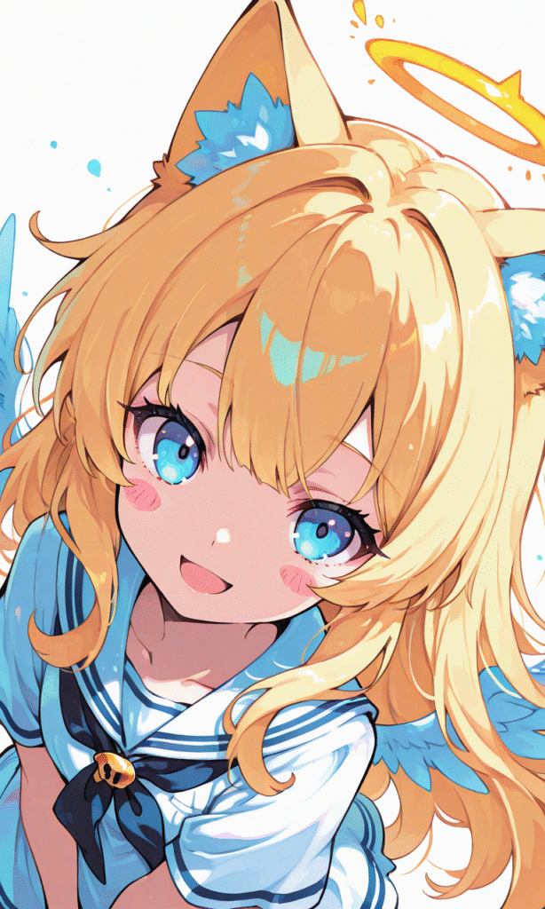 1girl, litre girl, blonde hair, long hair, cat ears, blue eyes, solid oval eyes, blush stickers, looking at viewer, ((face)), face focus, from above, halo, little wings, sailor dress, short sleeves, smile, open mouth, dutch angle, masterpiece, simple background, white background, high quality, high resolution, neon pop art style, tokiame, EyeDetailerXL, hyper-detailed, high contrast, depth of field, ray tracing, best lighting, cinematic composition, beautiful face, beautiful eyes, sharp focus, (masterpiece:1.2), (best quality:1.2), (very aesthetic:1.2), (absurdres:1.2), (detailed background)