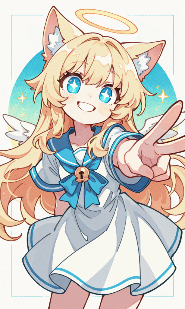 1girl, litre girl, solo, blonde hair, long hair, cat ears, blue eyes, cowboy shot, halo, little wings, sailor dress, short sleeves, upper body, ((v)), reaching, foreshortening, grin, masterpiece, simple background, white background, high quality, high resolution, tokiame, fantasy scene, white border, ultra detailed, extremely hyper pastel coloring, style, minimal linework, glowing eyes, halftones, white star pupils, pop art, hard cell shading, extreme foreshortening, cartoony, toonish, moe style, (circle head: 1.2), (oval eyes: 1.4), vibrant background