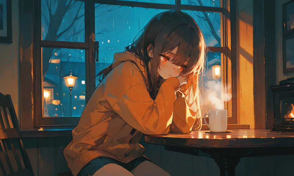 1girl,cowboy shot,Cozy retro café with warm lighting, steaming hot coffee on a wooden table,looking away, soft orange lampshade, rain outside the window,night outside the window, film photography style, warm color palette, highly detailed, ,hyper-detailed, high contrast, depth of field, ray tracing, best lighting, cinematic composition, beautiful face, beautiful eyes, sharp focus, (masterpiece:1.2), (best quality:1.2), (very aesthetic:1.2), (absurdres:1.2), (detailed background),tokiame,748cmstyle