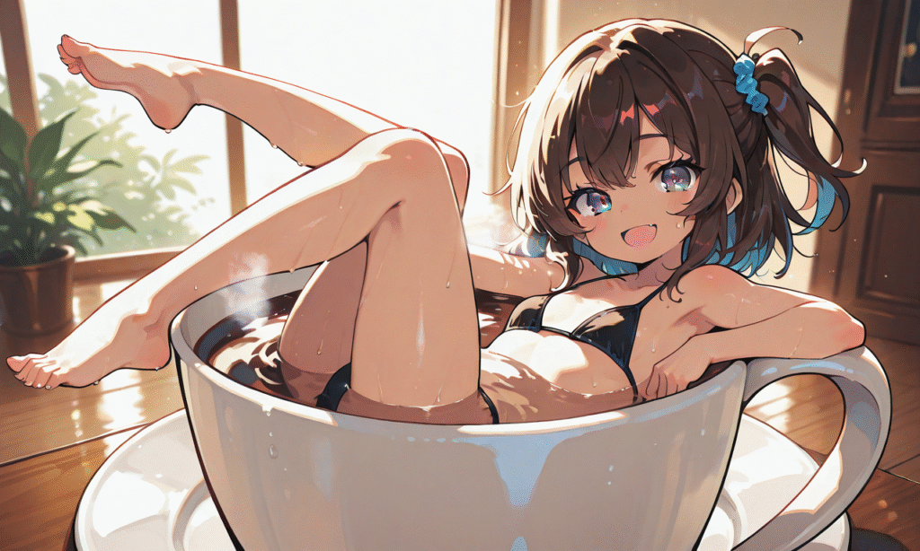 mini girl,little girl,solo,bikini,in oversize mug,coffee mug, submerged, looking at viewer,smile,open mouth,wet,steam, full body, simplebackground,masterpiece,high quality, high resolution ,tokiame,hyper-detailed, high contrast, depth of field, ray tracing, best lighting, cinematic composition, beautiful face, beautiful eyes, sharp focus, (masterpiece:1.2), (best quality:1.2), (very aesthetic:1.2), (absurdres:1.2), (detailed background),neon pop art style