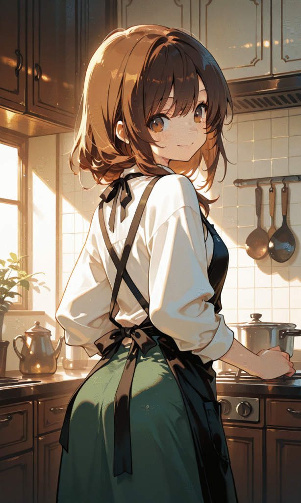 1girl, apron, smile, brown eyes, looking back, cowboy shot, kitchen, masterpiece, high quality, high resolution, tokiame, hyper-detailed, high contrast, depth of field, ray tracing, best lighting, cinematic composition, beautiful face, beautiful eyes, sharp focus, (masterpiece:1.2), (best quality:1.2), (very aesthetic:1.2), (absurdres:1.2), (detailed background)