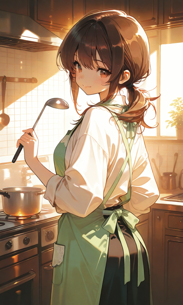 1girl, low ponytail, apron, smile, brown eyes, looking back, ladle, cowboy shot, kitchen, masterpiece, high quality, high resolution, tokiame, hyper-detailed, high contrast, depth of field, ray tracing, best lighting, cinematic composition, beautiful face, beautiful eyes, sharp focus, (masterpiece:1.2), (best quality:1.2), (very aesthetic:1.2), (absurdres:1.2), detailed background, soft colors