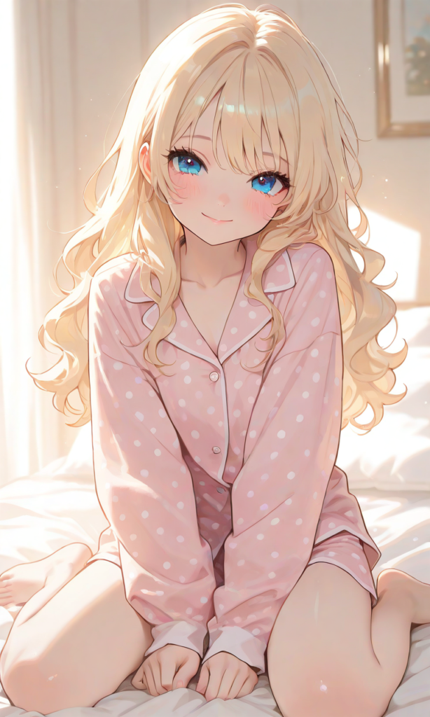PixAI【Shiitake-Mix】little girl,pink pajamas,polka dot pajamas, solo, long hair, shirt, blue eyes, blonde hair, wavy hair,smile, naked shirt, sitting, looking at viewer, barefoot, shorts, long sleeves, blush, closed mouth, wariza, collarbone,bed,masterpiece,high resolution,high quality, ,high-res,soft color, pale colors, light colors, soft focus, shiny skin, aegyo sal, watercolor, sketch lines, Cute girl, beautiful girl, Semi-realistic style, romantic atmosphere, sparkling, delicate face, beautiful eyes, long eyelashes, lying silkworm,elegant style,hyper-detailed, high contrast, depth of field, ray tracing, best lighting, cinematic composition, beautiful face, beautiful eyes, sharp focus, (masterpiece:1.2), (best quality:1.2), (very aesthetic:1.2), (absurdres:1.2), (detailed background),