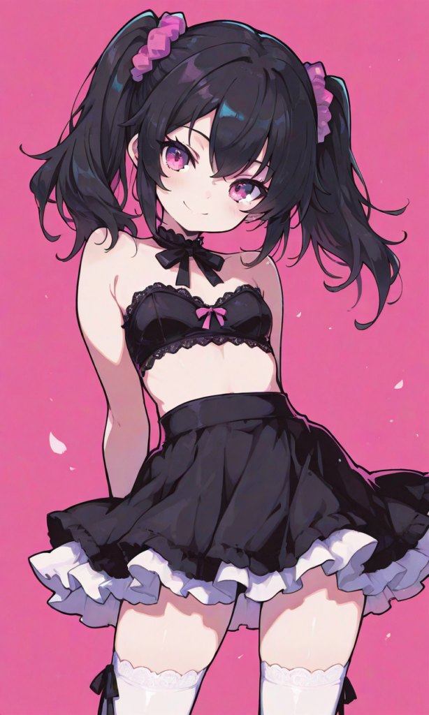 1 little girl,loli,black hair,twintail,hair scrunchie,strapless bra,lace black bra,black neckribbon, black skirt,micro skirt,white frilled skirt, white kneehighs,standing, smile,cowboy shot, pink background,masterpiece,high resolution,high quality, ,high-res,tokiame,neon pop art style,hyper-detailed, high contrast, depth of field, ray tracing, best lighting, cinematic composition, beautiful face, beautiful eyes, sharp focus, (masterpiece:1.2), (best quality:1.2), (very aesthetic:1.2), (absurdres:1.2), (detailed background),