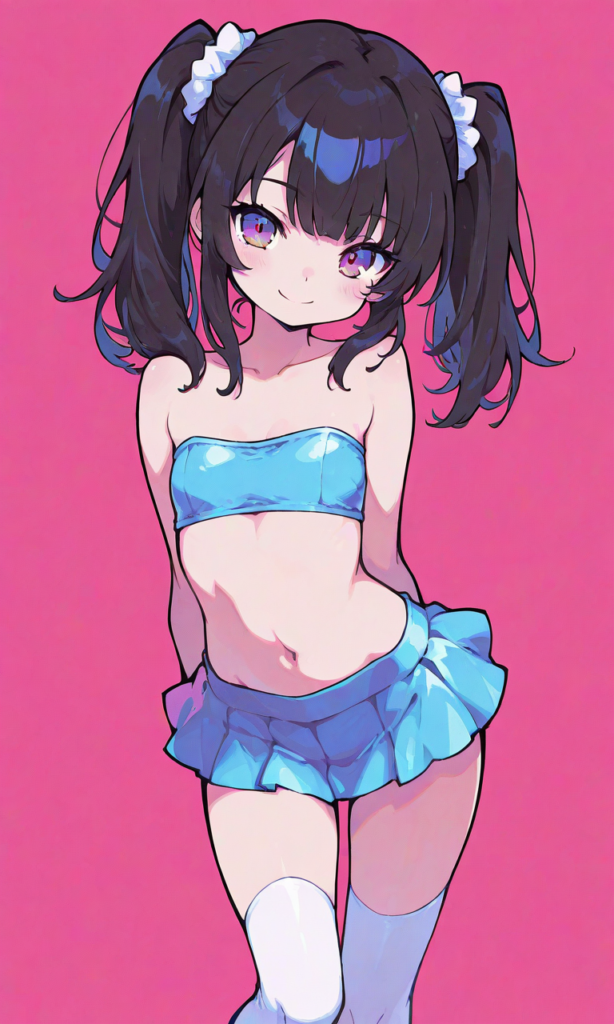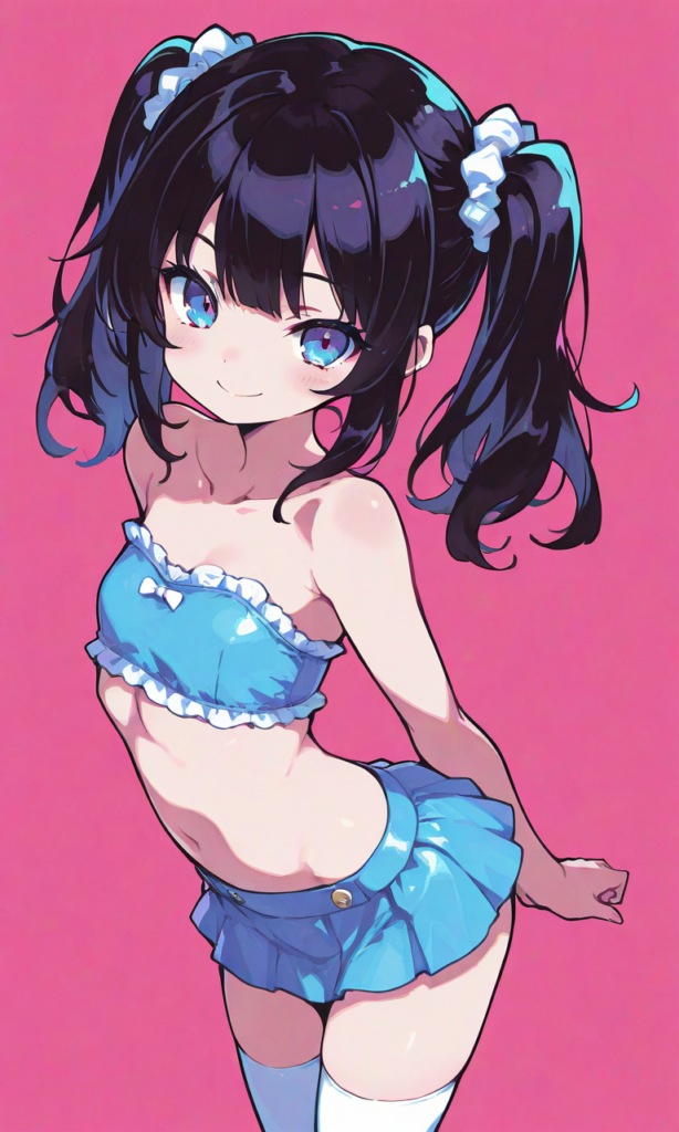 1 little girl,loli,black hair,twintail,hair scrunchie,strapless bra,light blue skirt,micro skirt,white kneehighs,standing, smile, pink background,masterpiece,high resolution,high quality, ,high-res,tokiame,neon pop art style,hyper-detailed, high contrast, depth of field, ray tracing, best lighting, cinematic composition, beautiful face, beautiful eyes, sharp focus, (masterpiece:1.2), (best quality:1.2), (very aesthetic:1.2), (absurdres:1.2), (detailed background),