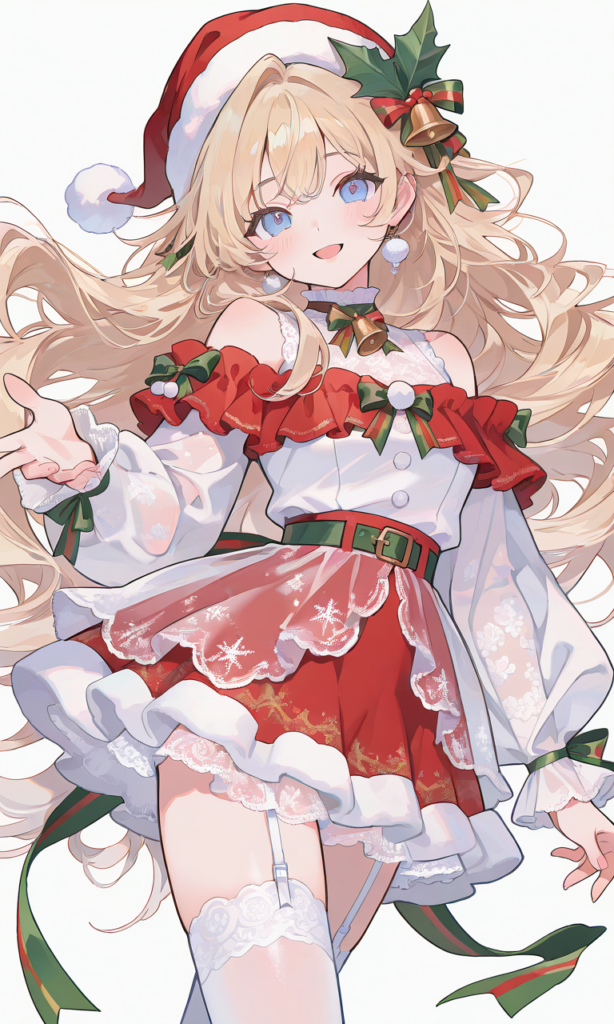 girl,smile,open mouth,outstretched hand, blonde hair, blue eyes, cowboy shot,simplebackground,white background, masterpiece,high quality, (Christmas-themed outfit: 1.5), (Layered outfit: 1.5), (Santa hat with leaf-shaped ribbon: 1.3), White faux fur collar with bells, (Red off-the-shoulder ruffled miniskirt dress: 1.5), (White sleeveless lace inner shirt: 1.5), (White see-through long sleeves: 1.5), (Lace frills on sleeve ends: 1.2), (Lace frills on skirt hem: 1.2), Green belt around waist, White lace thigh-high socks, White garter belt, , Green ribbon with bell on dress chest, (White embroidery on skirt hem: 1.2), Very cute outfit, Perfect design,high-res,yume335 style, (masterpiece),♡masterpiece, highest quality, ♡