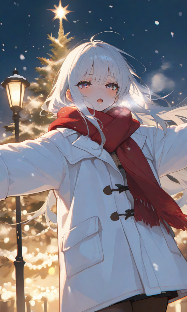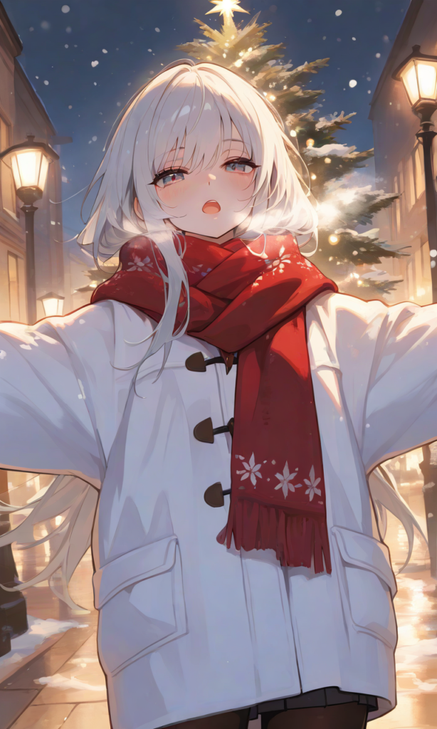 Top quality, masterpiece, 1girl, beautiful silver-haired girl, red scarf and white coat, snowy Christmas night street, warm light from street lamps, singing,open mouth, spread arms, white sparkles from her breath, tiny specks of light dancing around her, gentle yet slightly sad expression, the light of the Christmas tree reflected in her eyes, snowing, cinematic lighting, 8k, highly detailed, depth of field,cowboy shot,high-res,748cmstyle,Shining Style Art, masterpiece, best quality, very aesthetic, highres, absurdres,