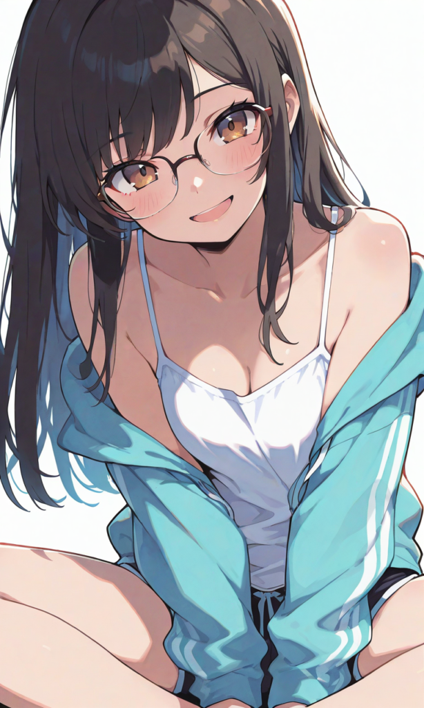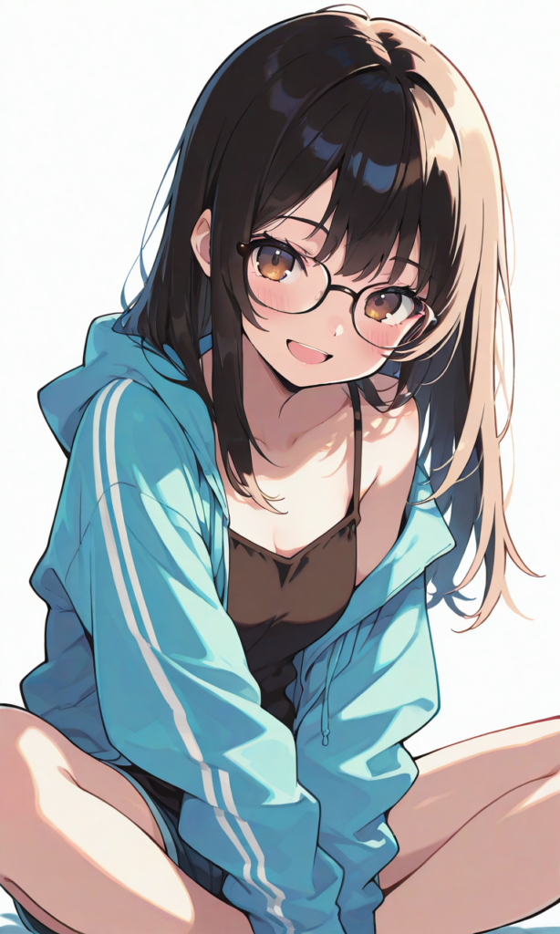 girl,straight hair, black hair,brown eyes, hoodie, glasses, white background, blush, simple background, looking at viewer, short shorts, camisole, smile,open mouth, cowboy shot,indian style, masterpiece,high quality, high resolution,high-res,hyper-detailed, high contrast, depth of field, ray tracing, best lighting, cinematic composition, beautiful face, beautiful eyes, sharp focus, (masterpiece:1.2), (best quality:1.2), (very aesthetic:1.2), (absurdres:1.2), (detailed background),neon pop art style