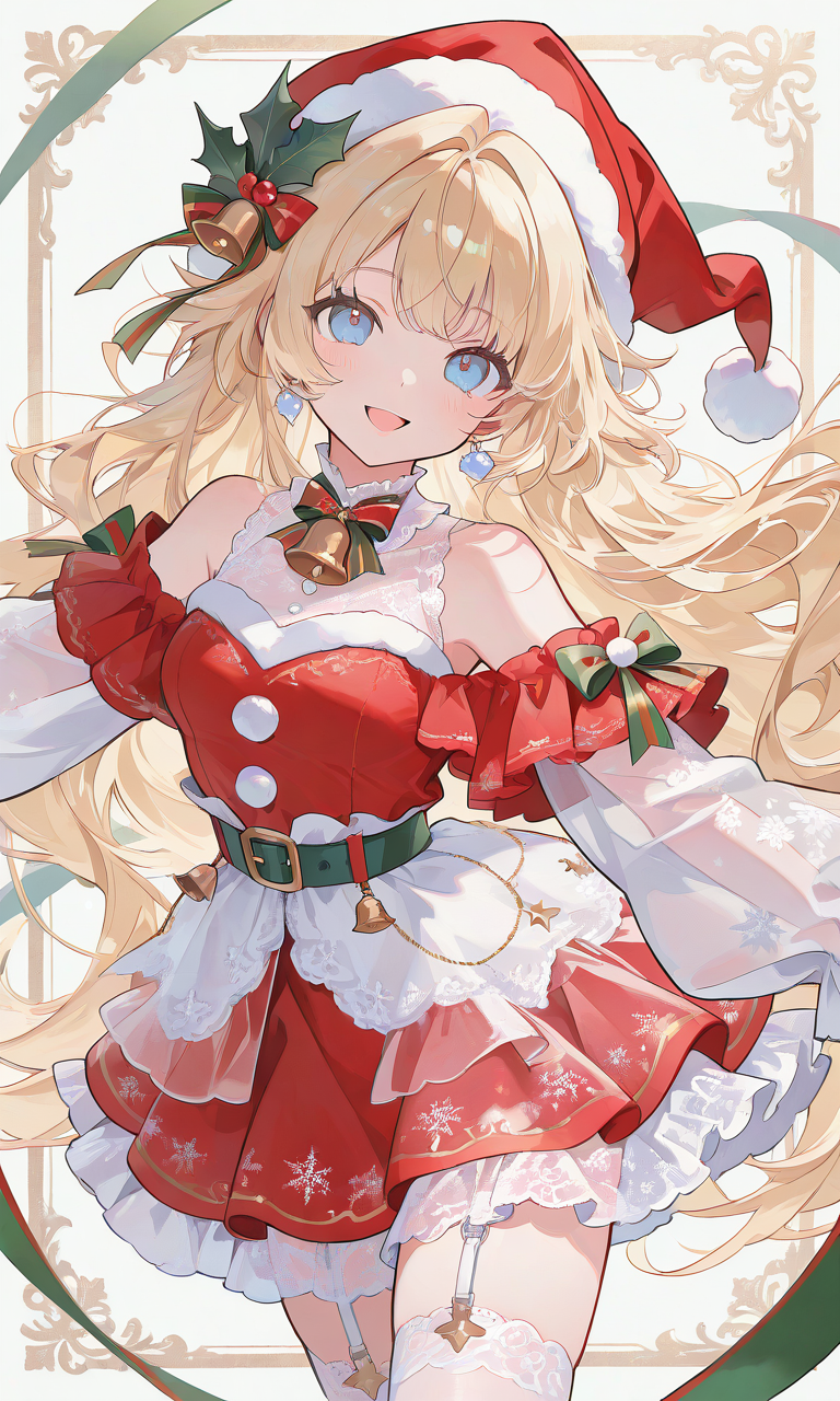 PixAI【Shiitake-Mix】girl,smile,open mouth,blonde hair, blue eyes, looking at viewer,spread arms, cowboy shot,masterpiece,high quality, (Christmas-themed outfit: 1.5), (Layered outfit: 1.5), (Santa hat with leaf-shaped ribbon: 1.3), White faux fur collar with bells, (Red off-the-shoulder ruffled miniskirt dress: 1.5), (White sleeveless lace inner shirt: 1.5), (White see-through long sleeves: 1.5), (Lace frills on sleeve ends: 1.2), (Lace frills on skirt hem: 1.2), Green belt around waist, White lace thigh-high socks, White garter belt, , Green ribbon with bell on dress chest, (White embroidery on skirt hem: 1.2), Very cute outfit, Perfect design,high-res,yume335 style, (masterpiece),♡masterpiece, highest quality, ♡,