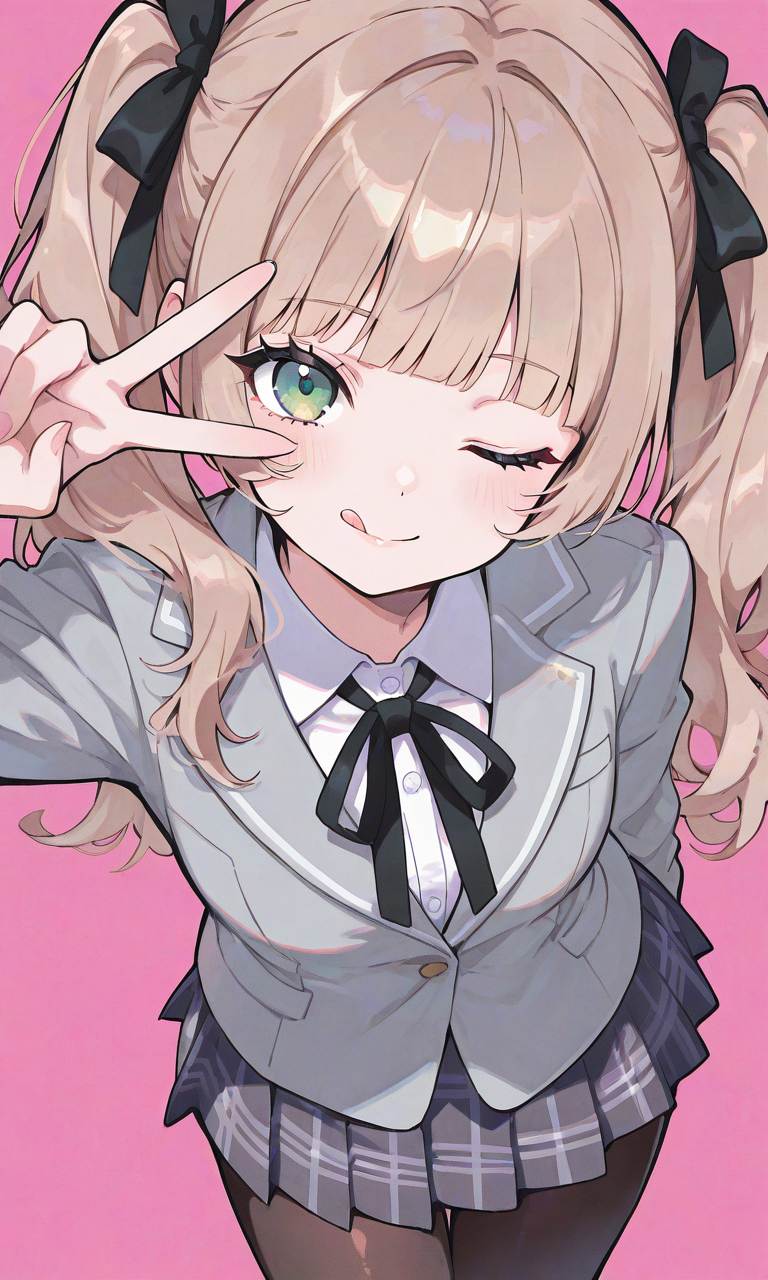 PixAI【Shiitake-Mix】girl,light brown hair, twintails, blunt bangs,shiny eyes,green eyes, black hairribbon,gray blazer,plaid skirt,pantyhose,neck ribbon,looking at viewer,smile,:q, one eye closed, eye side v,from above, cowboy shot,simple background, masterpiece,high resolution,high quality, ,high-res,neon pop art style,♡masterpiece, highest quality, ♡