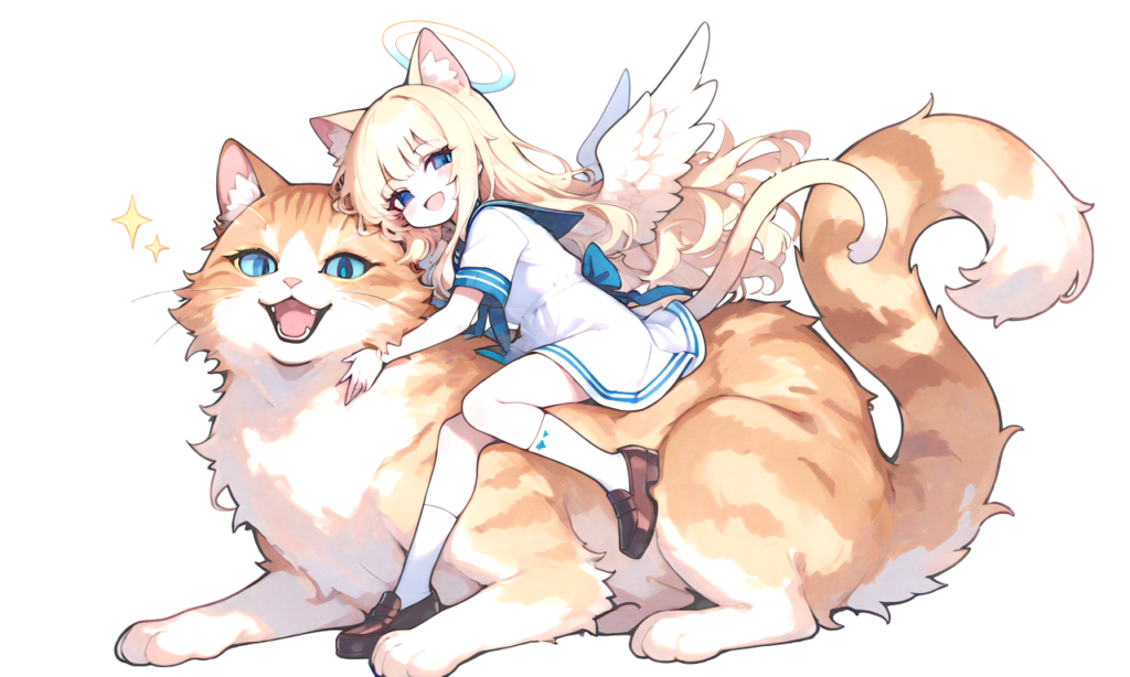 litre girl,solo, blonde hair,long hair,cat ears,blue eyes,looking at viewer,full body, cat tail,halo, little wings, sailor dress, short sleeves,white socks, loafers, Riding a big cat,oversized cat, looking at viewer, masterpiece, simple background, white background, high quality, high resolution,smile,open mouth, ,high-res,neon pop art style, Fantasy Scene, ,748cmstyle,Shining Style Art, masterpiece, best quality, very aesthetic, highres, absurdres