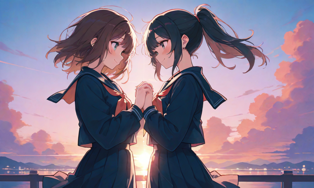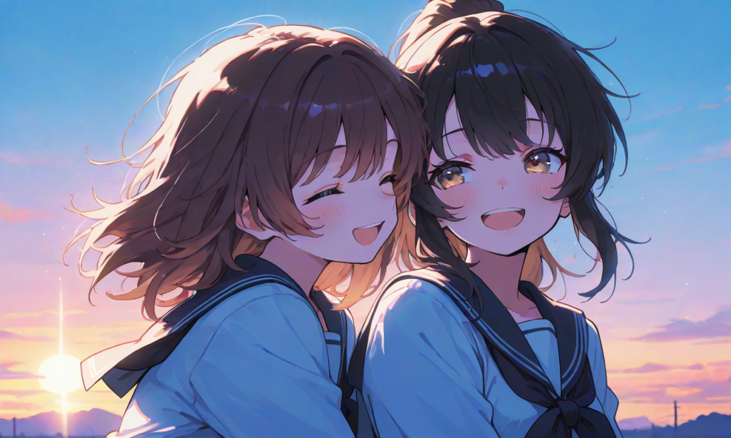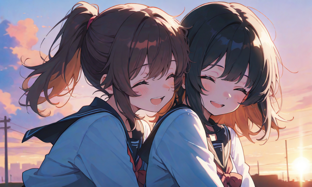 sunset,shoulder-to-shoulder, simplebackground,masterpiece,high quality, high resolution,high-res,hyper-detailed, high contrast, depth of field, ray tracing, best lighting, cinematic composition, beautiful face, beautiful eyes, sharp focus, (masterpiece:1.2), (best quality:1.2), (very aesthetic:1.2), (absurdres:1.2), (detailed background),neon pop art style,[Watercolor], soft lines, harmonious color palette