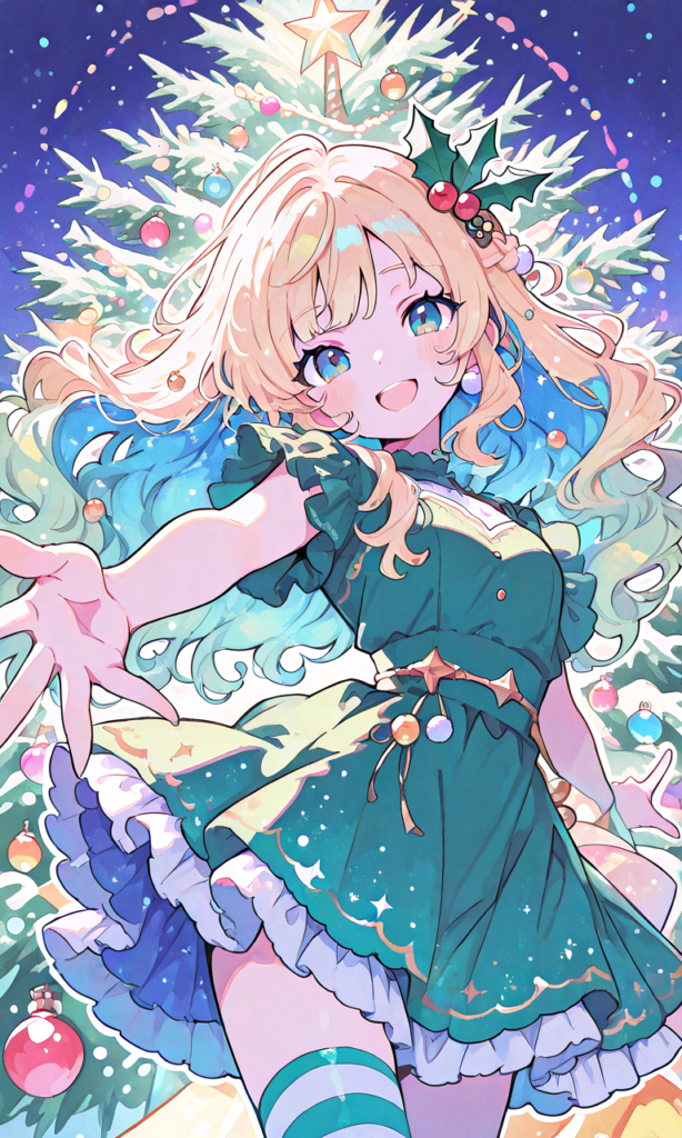 1girl, blonde hair, wavy hair, open mouth, spread arms, looking at viewer, cowboy shot, solo, cute mini dress shaped like a small Christmas tree, bright kelly green glitter fabric, green dress, layered tulle skirt with rainbow colored lights wrapped around, tiny colorful pom-pom ornaments, holly hair ornament, striped stockings, smiling, idol-style model posing in front of a giant real Christmas tree, kawaii aesthetic, vibrant colors, studio lighting, ultra detailed, high-res, masterpiece, highest quality, neon pop art style, flatline, flat vector illustration, vivid colors, white thick outline, outline, blue inner hair color, watercolor, soft light, (detailed_hands:1.5)