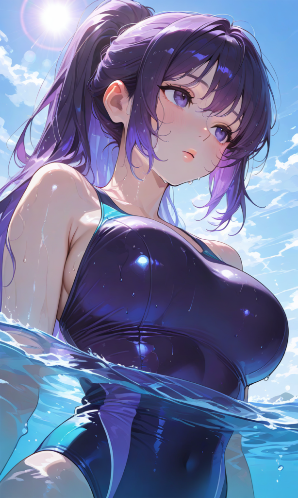 PixAI【Shiitake-Mix】1girl,high ponytail, dark purple hair,upturned eyes, large breast,competition swimsuit,wet hair, partially submerged,looking away, from below, upper body, Heavy lens flare,masterpiece,high resolution,high quality, ,high-res,1girl, high quality, ultra-detailed, soft shading, glossy skin, vibrant colors, realistic lighting, close-up composition, natural highlights, smooth rendering, anime style, wet effect, upper body focus,♡masterpiece, highest quality, ♡