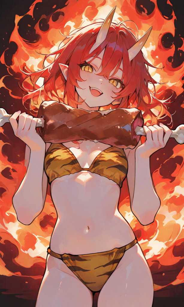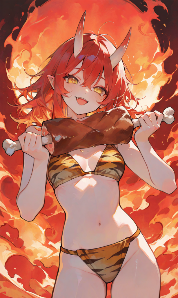 1girl, oni, oni horns, solo, TIGER bikini, red hair, messy hair, yellow eyes, medium hair, smile, open mouth, holding meat on the bone, big meat, cowboy shot, fire background, masterpiece, high quality, high resolution, high-res, 748cmstyle, ♡masterpiece, highest quality, ♡