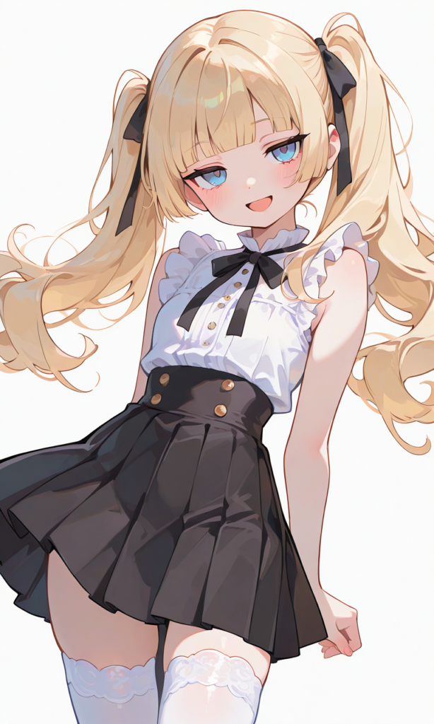 little girl,blonde hair, twintails,blunt bangs,jitome, Black hairribbon,pink frilled blouse,sleeveless,neck ribbon, high-waist skirt, Black pleated skirt,white frilled trimmed,white thighhighs, smile,open mouth, cowboy shot,simplebackground,white background, masterpiece,high quality, high resolution,high-res,neon pop art style,♡masterpiece, highest quality, ♡