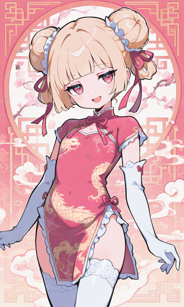 little girl, blonde hair, ((double bun)), blunt bangs, jitome, hair ribbon, pink china dress, neck ribbon, frilled trimmed, white thighhighs, white elbow gloves, smile, open mouth, cowboy shot, Chinese pattern background, minimalism, masterpiece, high quality, high resolution, high-res, neon pop art style, ♡masterpiece, highest quality, ♡