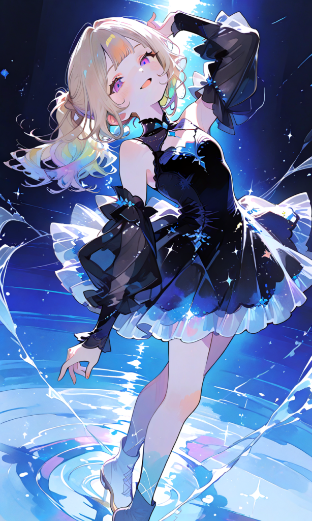 little girl,light brown hair,ponytail, blunt bangs, smile,open mouth,looking at viewer, figure skating dress,black dress, detached sleeves,silk dress,shine,Sparkling particles, Skating rink,full body, motion lines,wide shot, simplebackground,on ice,♡masterpiece, highest quality, ♡,high-res,748cmstyle,cinematic lighting , cinematic angle, soft light , color detail, backlighting, Depth of field, long exposure, light steps, intricate colors, vibrant colors,(watercolor_(medium):1.2)(simple coloring,flat color:2)dutch angle