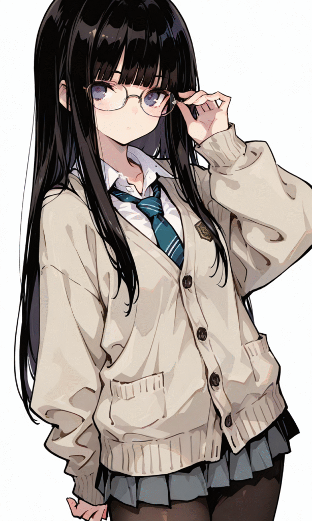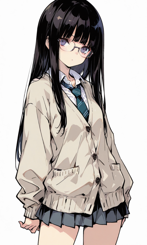 1girl, black hair, long hair, straight hair, blunt bangs, glasses, school uniform, dress shirt, necktie, cardigan, gray miniskirt, cowboy shot, simple background, white background, masterpiece, high quality, high resolution, tokiame, 748cmstyle, tokiame, 748cmstyle