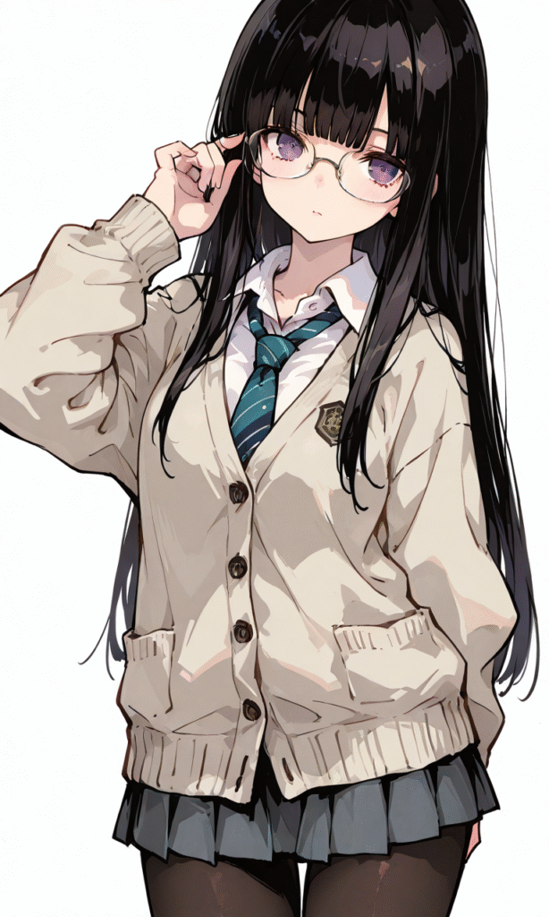 1girl, black hair, long hair, straight hair, blunt bangs, glasses, school uniform, dress shirt, necktie, cardigan, gray miniskirt, pantyhose, cowboy shot, simple background, white background, masterpiece, high quality, high resolution, tokiame, 748cmstyle, tokiame, 748cmstyle