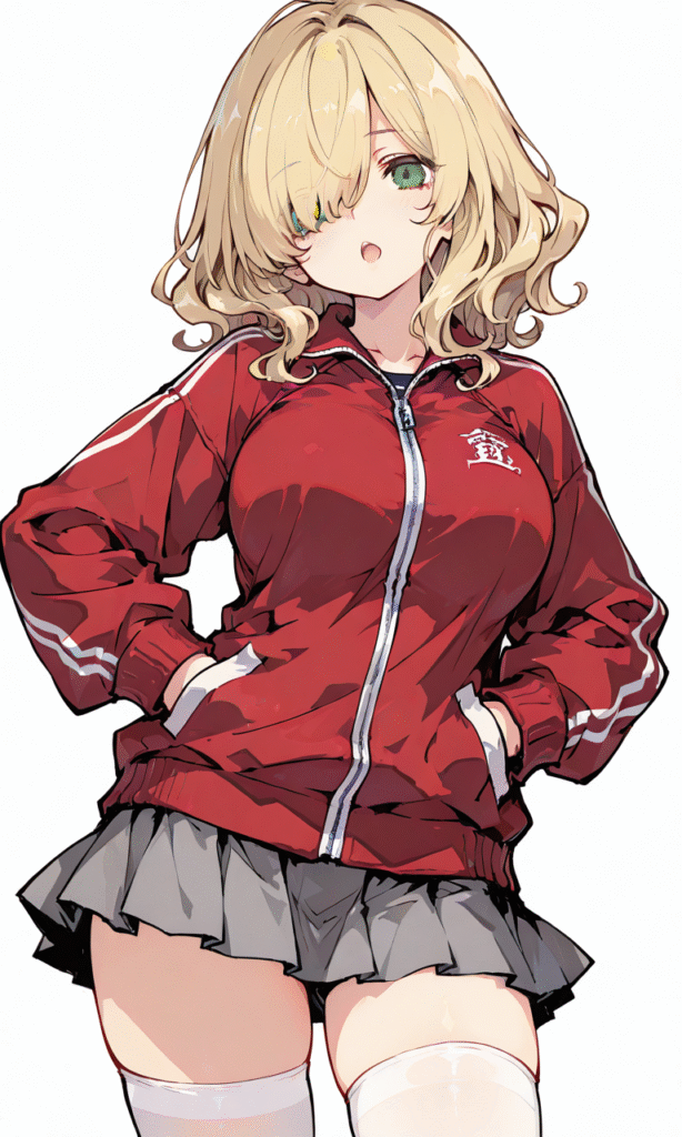 1girl, blonde hair, medium hair, wavy hair, hair over one eye, open mouth, green eyes, red tracksuit, gray miniskirt, white thighhighs, cowboy shot, simple background, white background, masterpiece, high quality, high resolution, tokiame, 748cmstyle