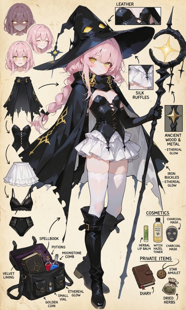 girl,light pink hair,single braid,yellow eyes, black witch,black elbow gloves,scarf,cloak,Bustier,small breast,white miniskirt,((long boots)),white thighhighs, full body, looking at viewer,holding staff, standing, masterpiece,high quality, simplebackground,white background,♡masterpiece, highest quality, ♡,high-res,748cmstyle