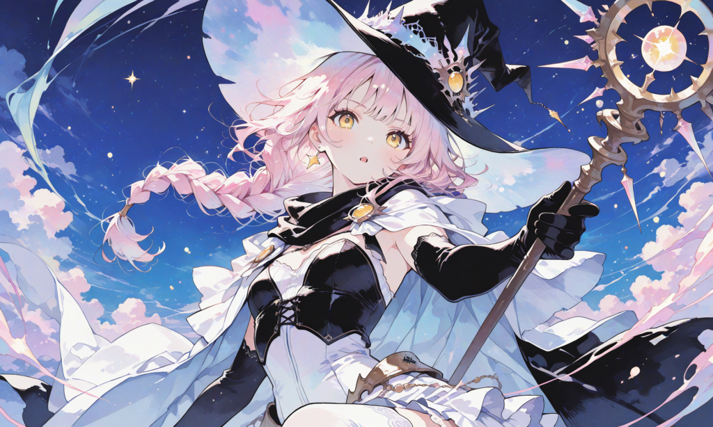 girl,light pink hair,((single braid)),yellow eyes, (black) witch,witch hat, black elbow gloves,scarf,cloak,Bustier,small breast,white miniskirt,white thighhighs, upper body, open mouth,incoming attack, serious, looking at viewer,holding staff,night sky, masterpiece,high quality, ,high-res, Fantasy Scene, ,(watercolor_(medium):1.2)(simple coloring,flat color:2)dutch angle,♡masterpiece, highest quality, ♡