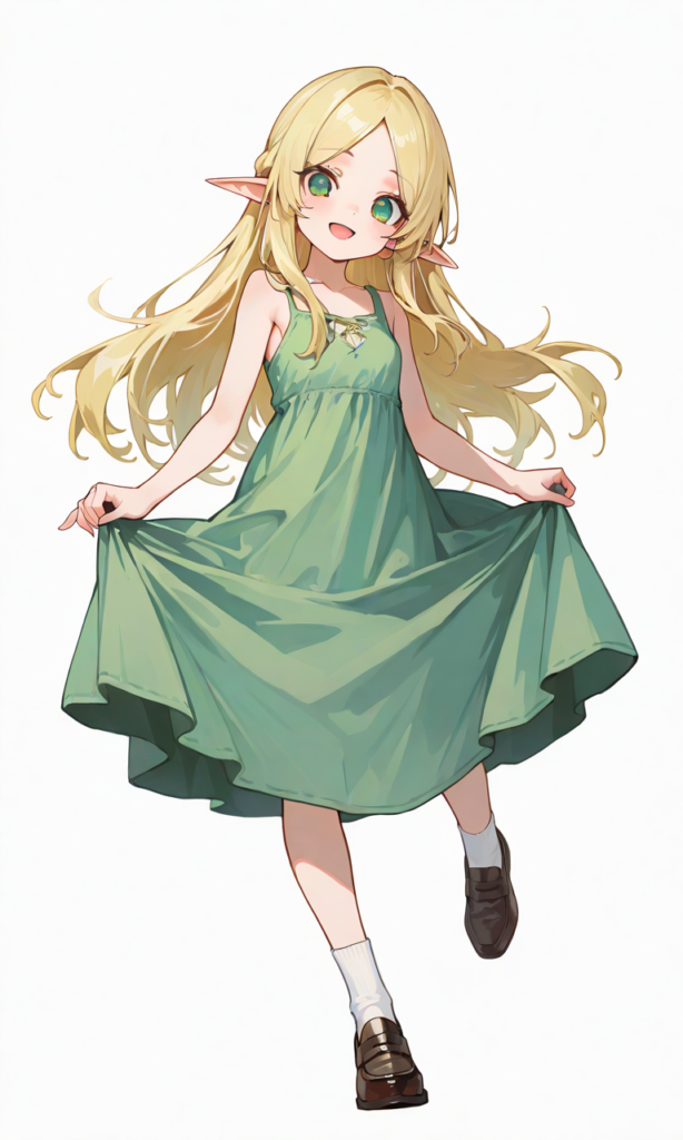 PixAI【Shiitake-Mix】girl,elf,solo,blonde hair, long hair,parted bangs, green eyes,big eyes,green sundress, long skirt, smile,open mouth,small breast, looking at viewer, full body, white socks, loafers, simplebackground,white background, masterpiece,high quality,high resolution ,high-res,748cmstyle