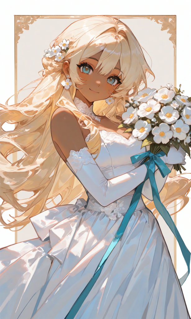 girl,blonde hair, long hair, dark skin, smile,looking at viewer,wedding dress,long skirt, elbow gloves, holding wrapping bouquet, small white flower, cowboy shot,simple background,outside border, masterpiece,high resolution,high quality,high-res,clndl_style,♡masterpiece, highest quality, ♡