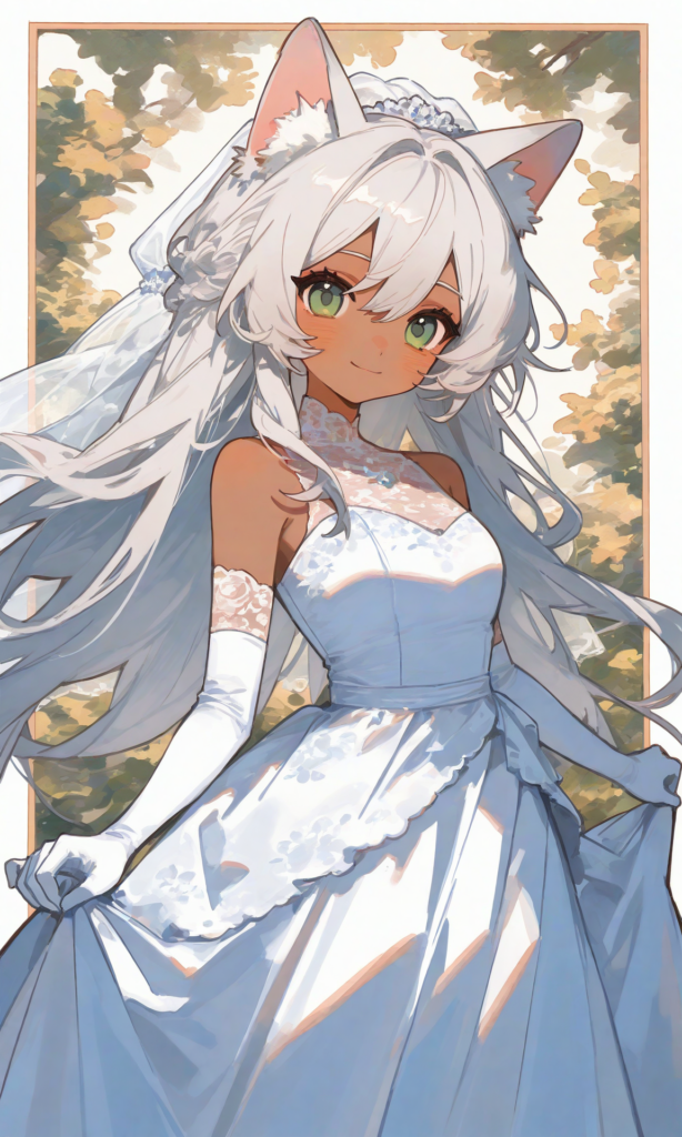 girl,silver hair, long hair, dark skin,cat ears, smile,looking at viewer,wedding dress,long skirt, elbow gloves,cowboy shot,simple background,outside border, masterpiece,high resolution,high quality,high-res,clndl_style,[Watercolor], soft lines, harmonious color palette