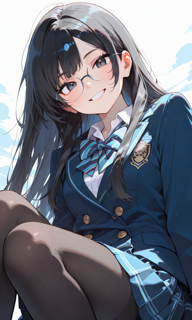 1girl,black hair, double-parted bangs, long hair, straight hair, glasses, tsurime, ((sanpaku)), school uniform, Double-breasted blazer ,dark blue blazer,striped bowtie, pleated skirt, pantyhose,sitting, invisible chair, knees up, grin,looking at viewer, from below, cowboy shot,simple background, masterpiece,high resolution,high quality, ,high-res,♡masterpiece, highest quality, ♡,[Watercolor], soft lines, harmonious color palette