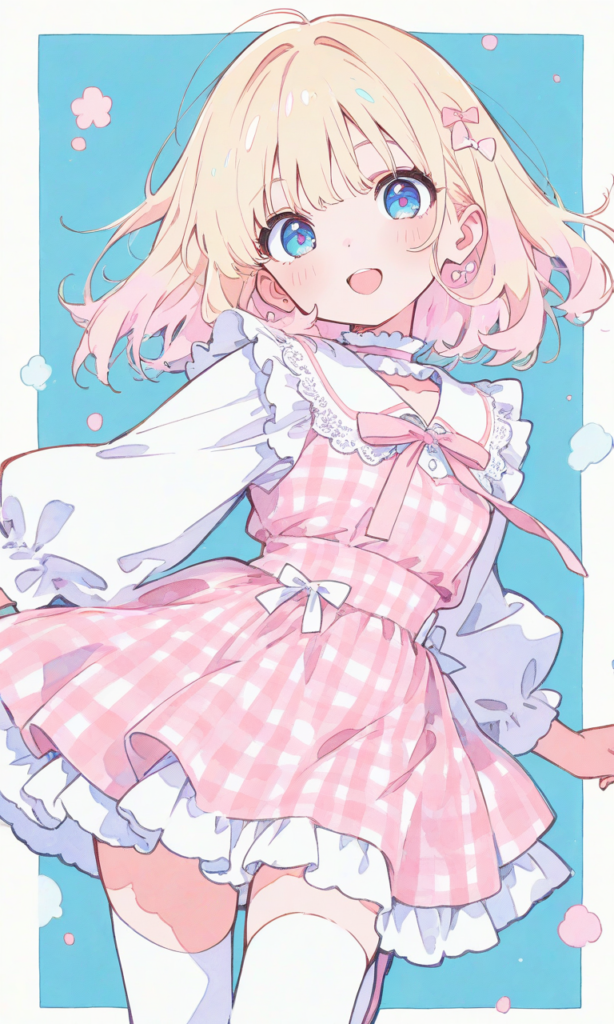 blonde hair, cowboy shot,Elegant yet cute French girly spring look on an anime girl,((solo)), white lace-trimmed blouse with ruffled collar,puffy sleeves, pale pink gingham check skirt, white thighhighs, oversized soft pink bow in her hair, gentle smile,skipping, open mouth, sophisticated kawaii anime illustration, soft natural lighting, highly detailed fabric and accessories,watercolor, minimalism, masterpiece,high resolution,high quality, looking at viewer, sketch style, watercolor effect, pastel colors,high-res,{masterpiece},{chibi} ,{chibi style anime illustration},{Deformed},{best quality}, {illustration},{thick outline},{outlined vector graphics},{2d cel anime},{flat color style},{simple coloring style},Only one person depicted, big eyes, a short limbs,