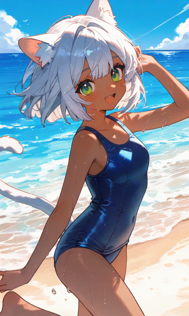 girl,silver hair, bob cut, dark skin,cat ears, smile,open mouth,looking at viewer,school swimsuit,skipping, beach, wet,summer, blue sky, cowboy shot, masterpiece,high resolution,high quality,high-res,[Watercolor], soft lines, harmonious color palette ,clndl_style