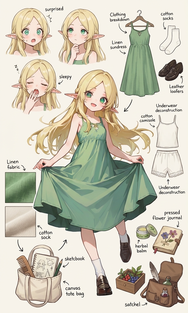 PixAI【Shiitake-Mix】girl,elf,solo,blonde hair, long hair,parted bangs, green eyes,big eyes,green sundress, long skirt, smile,open mouth,small breast, looking at viewer, full body, white socks, loafers, simplebackground,white background, masterpiece,high quality,high resolution ,high-res,748cmstyle