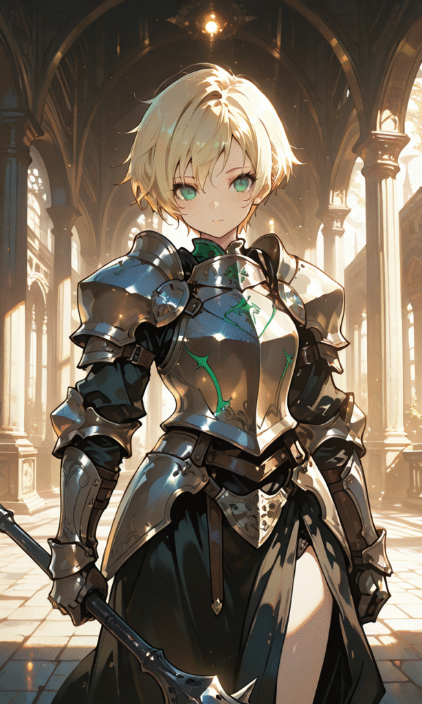 PixAI【Shiitake-Mix】Girl,blonde hair, very short hair, messy hair,green eyes, armor, gauntlets,holding mace, cowboy shot,temple, masterpiece,high quality,high resolution ,tokiame,hyper-detailed, high contrast, depth of field, ray tracing, best lighting, cinematic composition, beautiful face, beautiful eyes, sharp focus, (masterpiece:1.2), (best quality:1.2), (very aesthetic:1.2), (absurdres:1.2), (detailed background), Fantasy Scene,