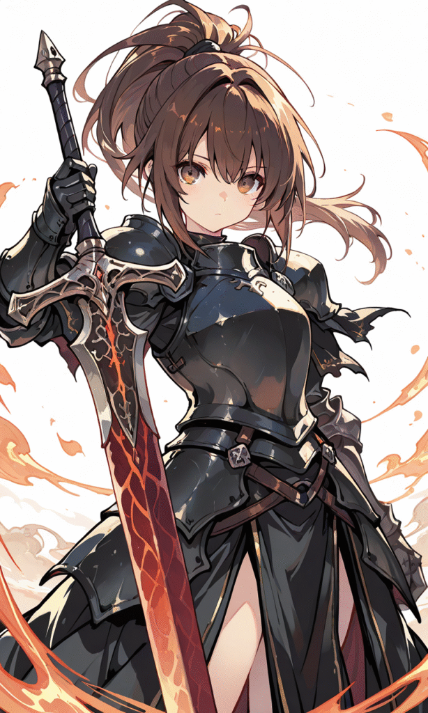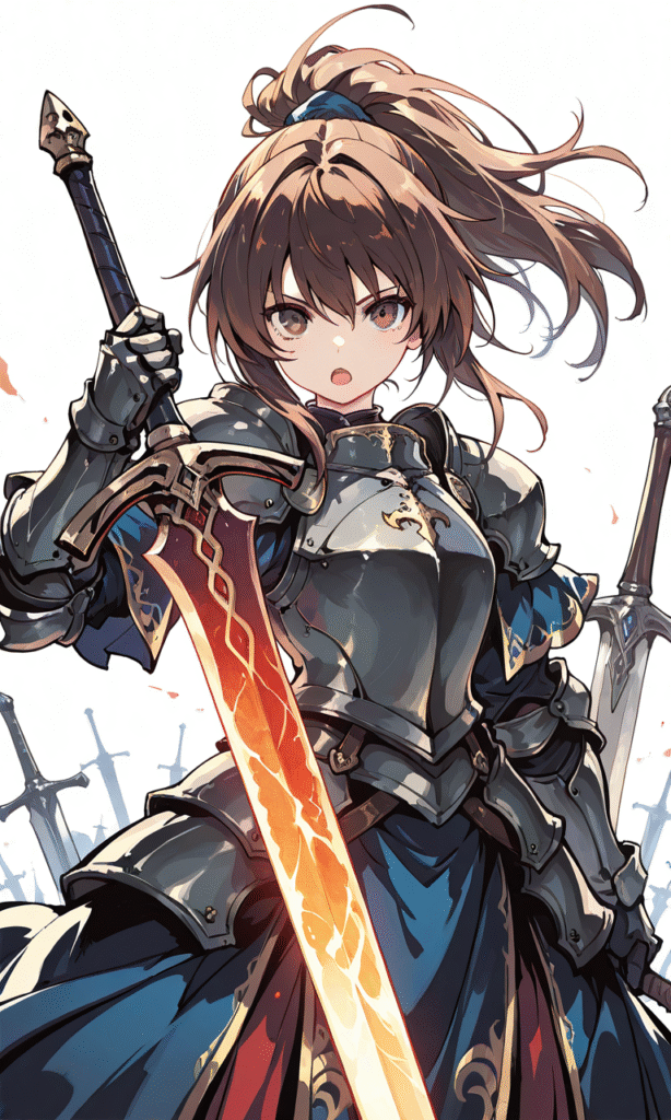girl,brown hair, ponytail,armored dress, holding 2swordes, broad sword,looking at viewer, cowboy shot,simplebackground,white background, masterpiece,high quality, high resolution,tokiame, Fantasy Scene,