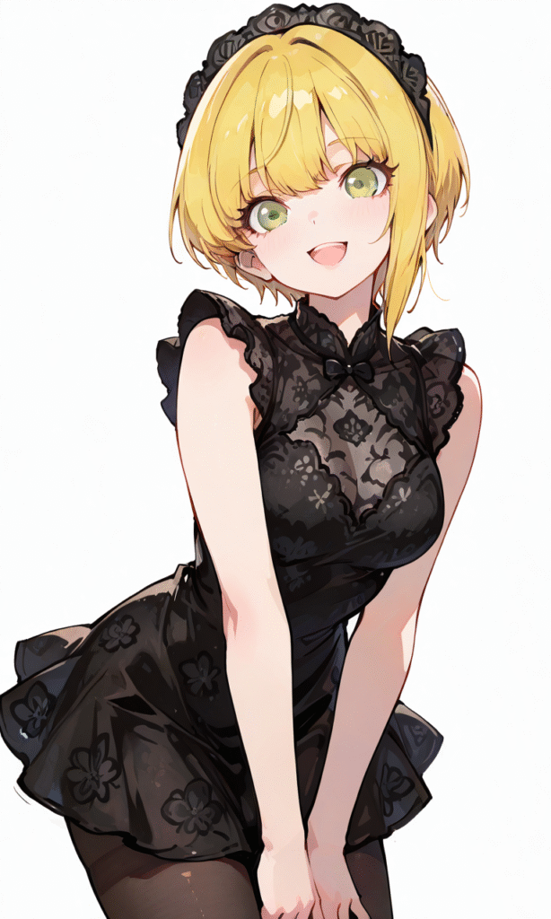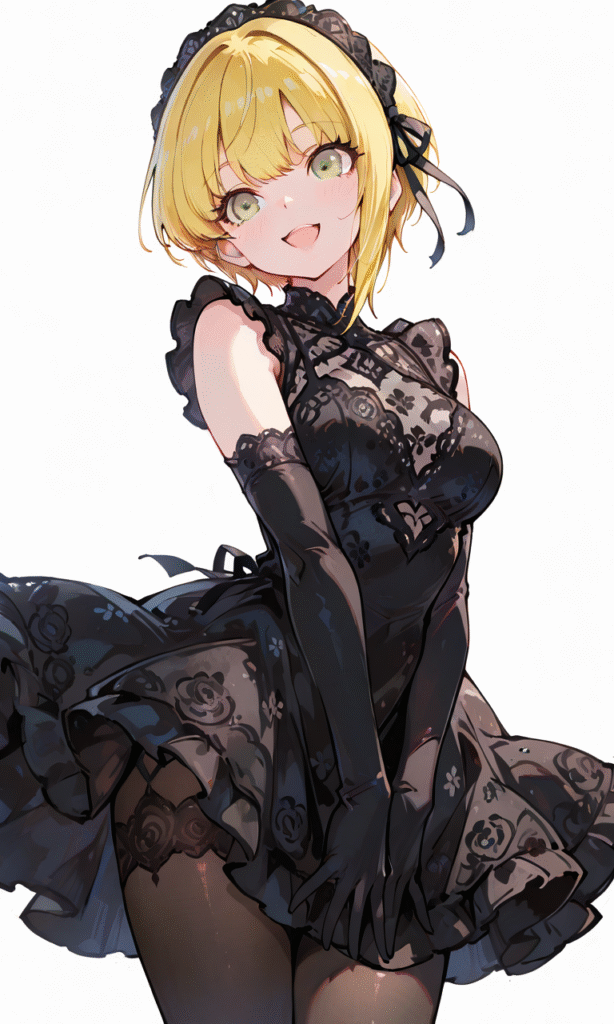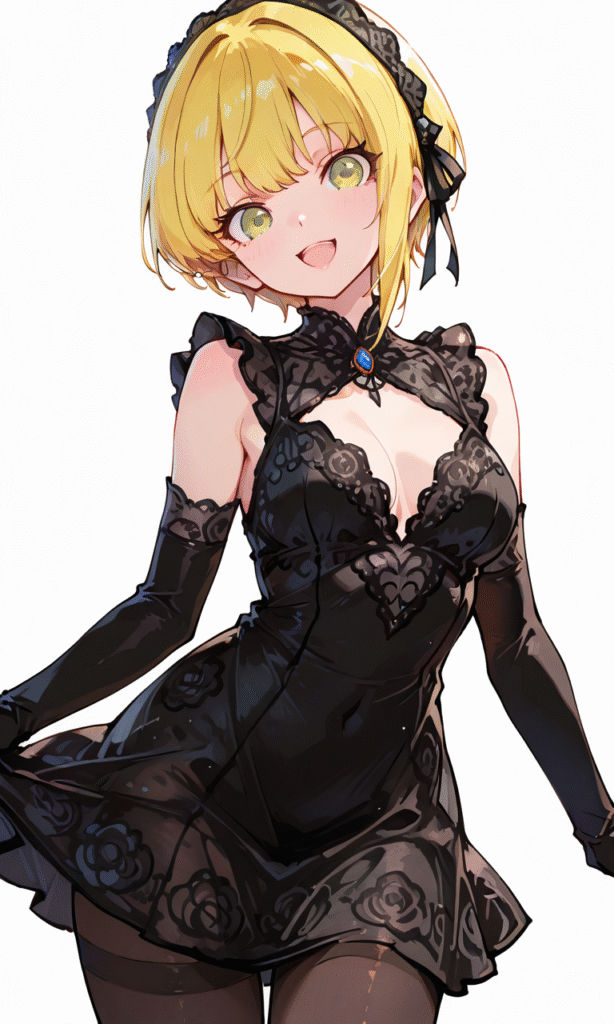 PixAI【Shiitake-Mix】miyamoto frederica, smile,open mouth,black lace dress,sleeveless,pantyhose,lace hairband,elbow gloves,looking at viewer, cowboy shot,simplebackground,white background, masterpiece,high quality, high resolution
