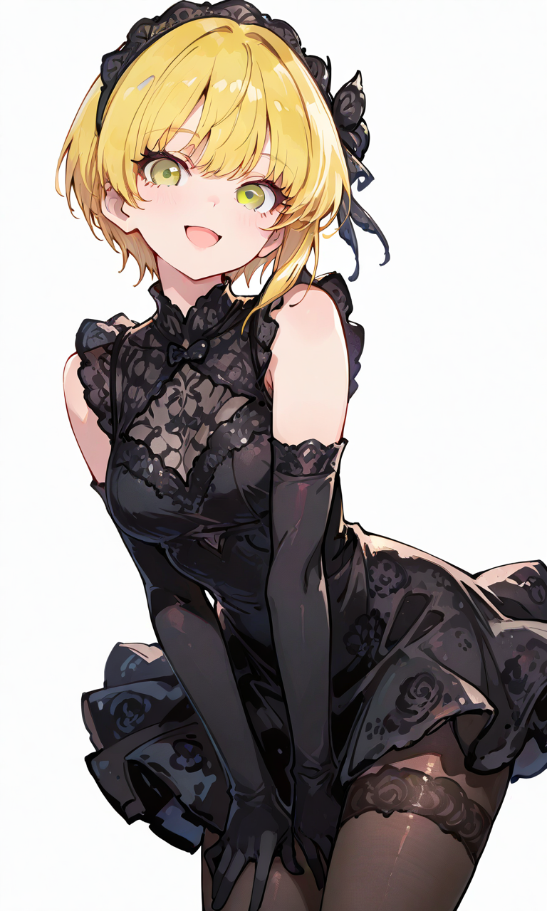 PixAI【Shiitake-Mix】miyamoto frederica, smile,open mouth,black lace dress,sleeveless,pantyhose,lace hairband,elbow gloves,looking at viewer, cowboy shot,simplebackground,white background, masterpiece,high quality, high resolution