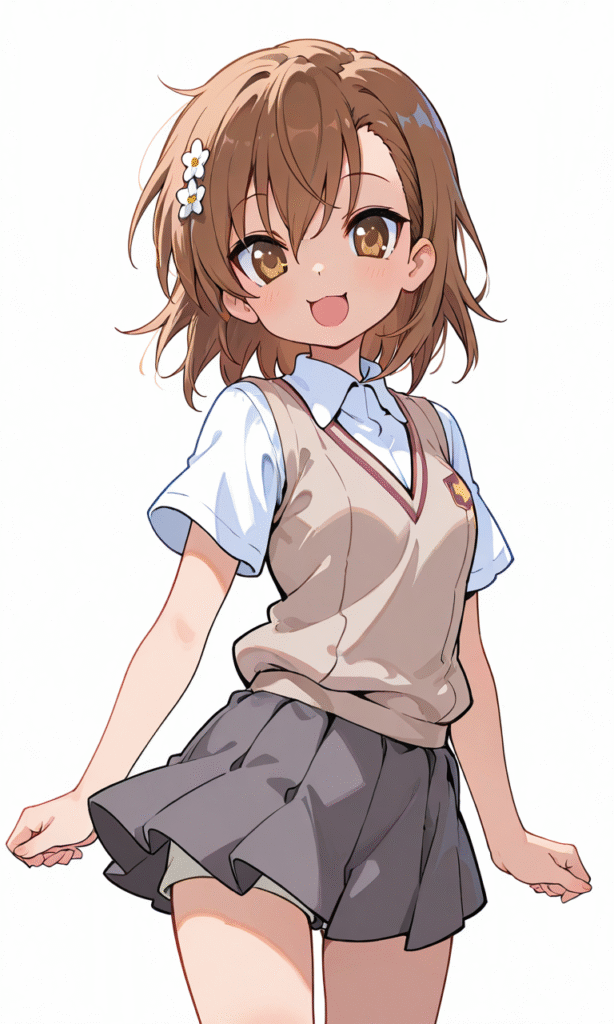 PixAI【Shiitake-Mix】misaka mikoto, misaki kurehito (style),tokiwadai school uniform, short sleeves, smile,open mouth, cowboy shot,simplebackground,white background, masterpiece,high quality, high resolution,tokiame