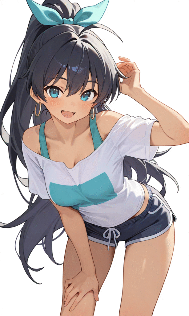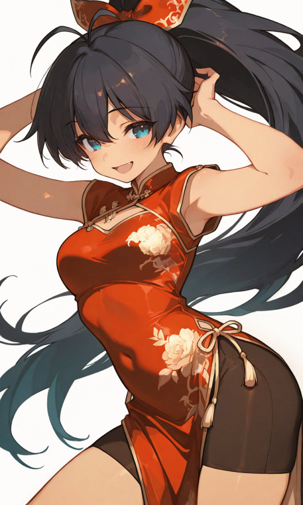 PixAI【Shiitake-Mix】ganaha hibiki, smile,open mouth,red china dress,bike shorts, cowboy shot,simplebackground,white background, masterpiece,high quality, ,tokiame,Reina_style, clean lineart, cel shading, teal-blue palette, soft glow