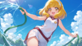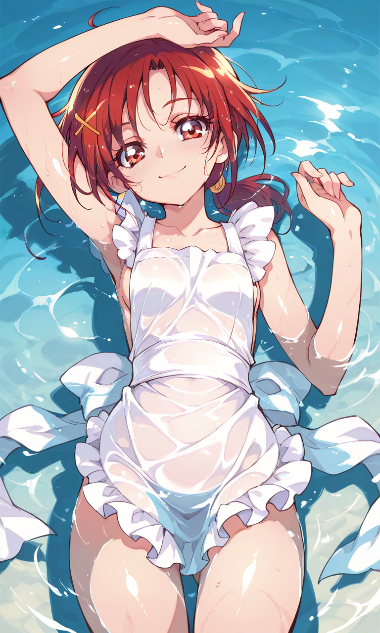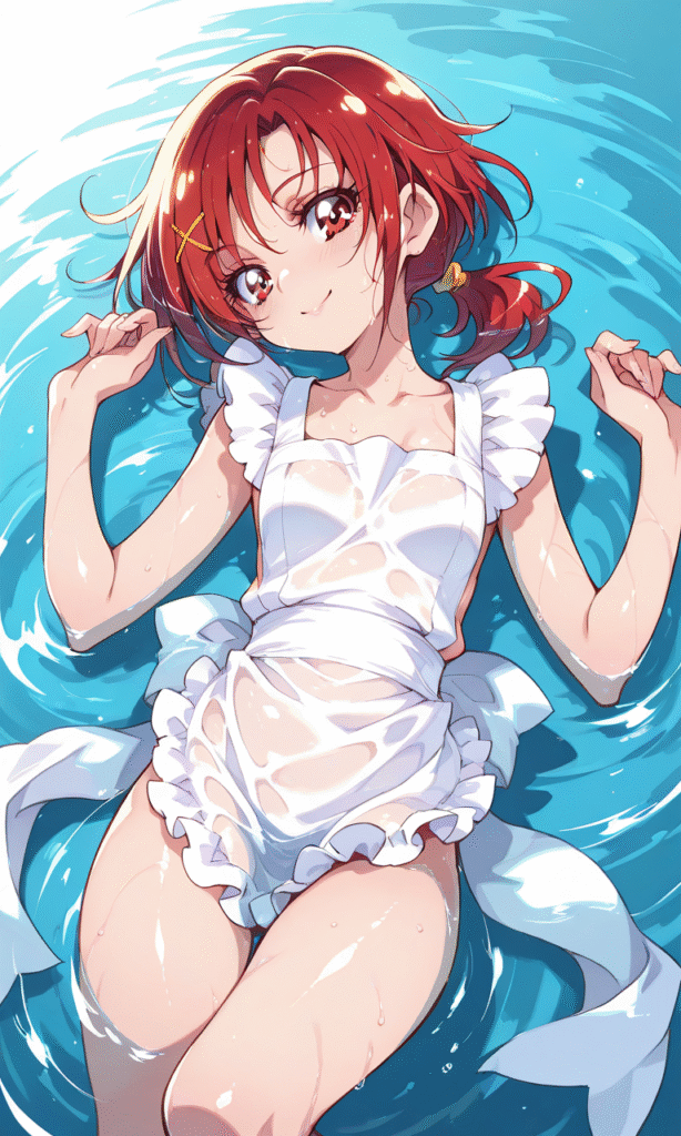 PixAI【Shiitake-Mix】hino akane(precure),short hair, low ponytail, smile,naked apron,white apron, lying,on back,arm up, cowboy shot, water,partially submerged,wet, masterpiece,high quality, ,tokiame,shiny skin, shiny,Perfect Hands